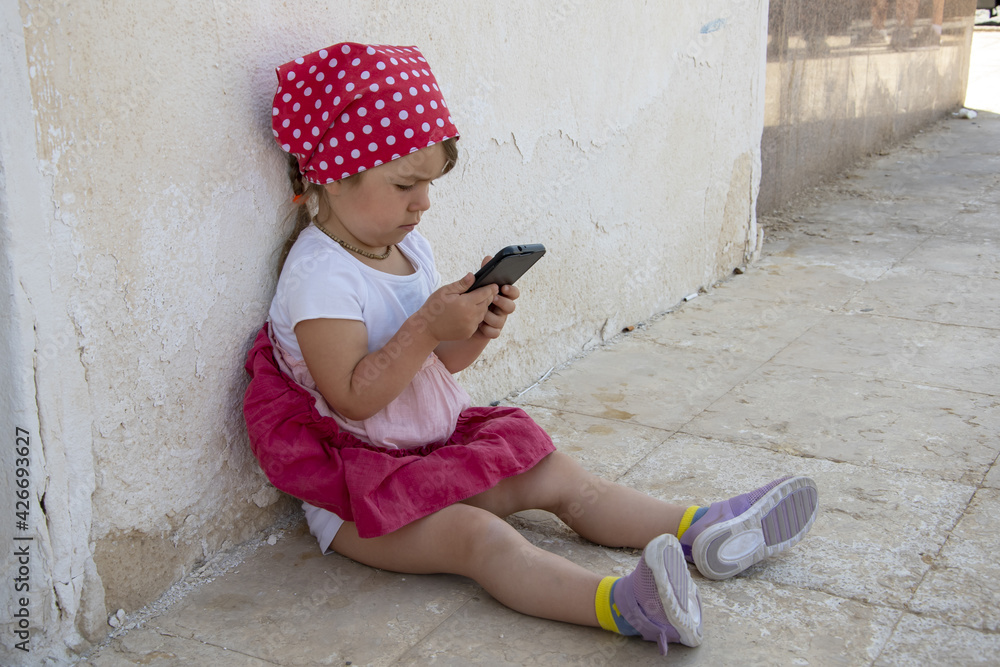 A little girl sitting on the street and looking at a mobile phone, leaning back against the wall, the general plan. Concept: modern gadgets for children, spending time on the Internet, children's mode