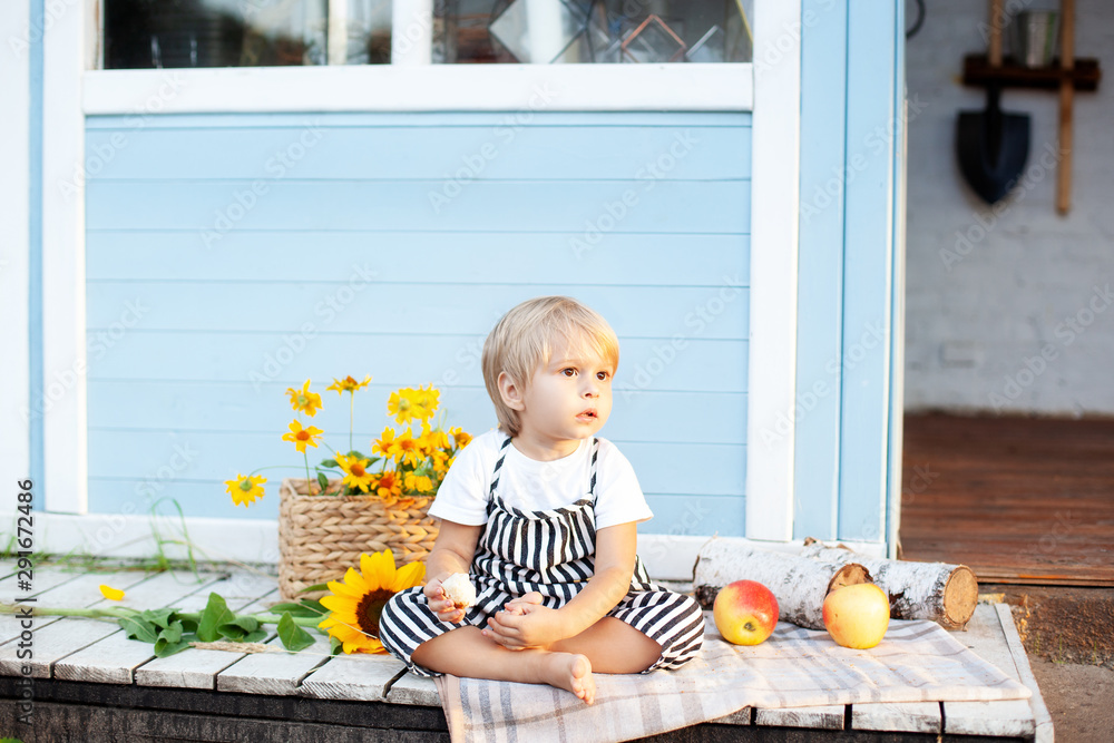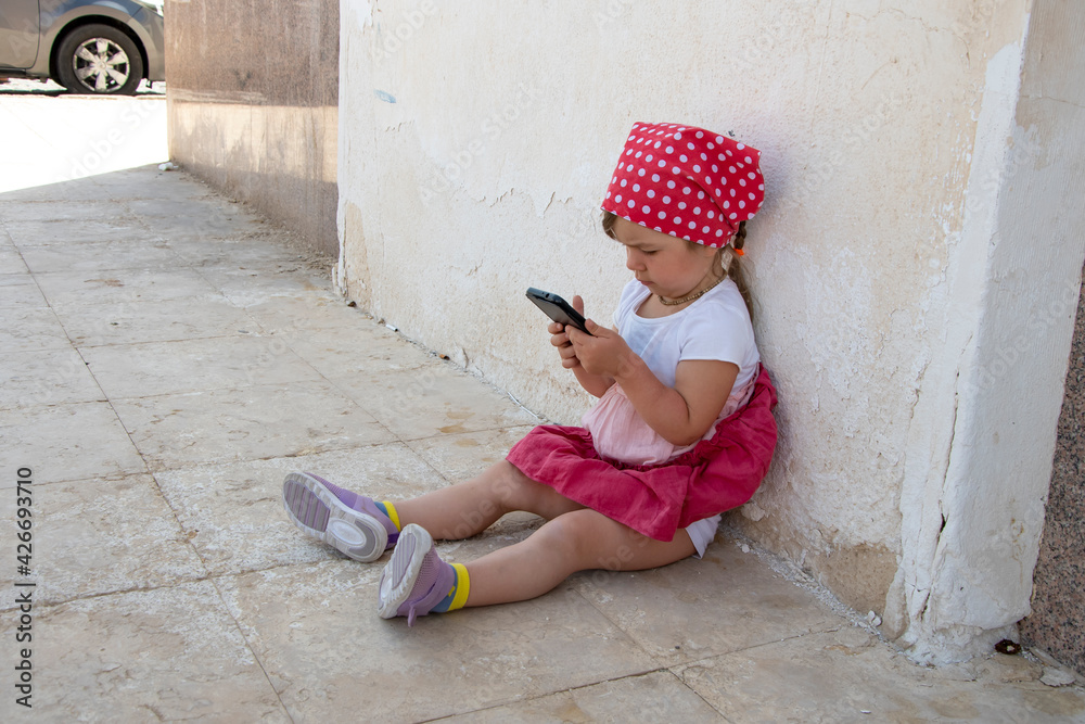 A little girl sits outside in the summer and looks at her mobile phone, leaning her back against the wall, the general plan. Concept: modern gadgets for children, spending time on the Internet, childr