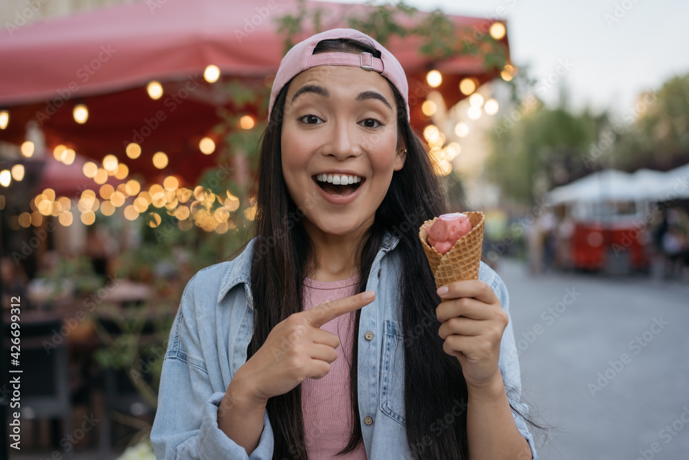 Young excited asian woman eating ice cream on the street. Emotional hipster wearing casual clothing holding tasty dessert, selective focus. Food fair concept