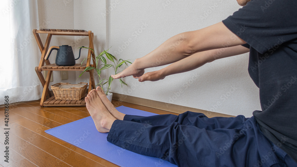 自宅で前屈ストレッチをする男性。体の硬い男性のイメージ