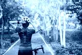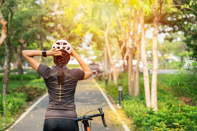 Sporty girl biker posing with bicycle in the forest on sunny day. Outdoor sport activity, lifestyle concept