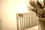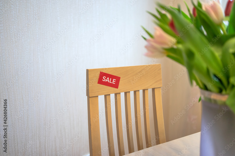 Sticker with the inscription sale on a wooden chair in the kitchen interior, next to a bouquet of flowers
