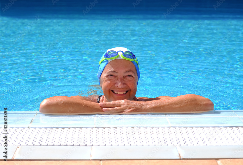 Smiling mature woman at the edge of the pool after swimming, wearing swimming cap and goggles. Healthy lifestyle