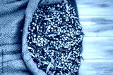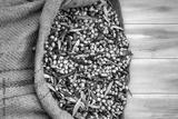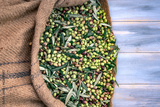Harvested fresh olives in sacks for olive oil production, on a wooden table, Crete, Greece