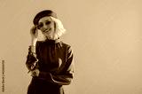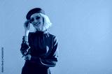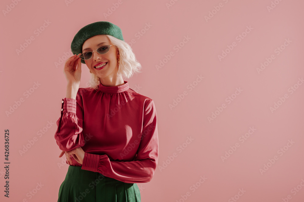 Spring fashion concept: happy smiling elegant woman wearing stylish green beret, sunglasses, satin blouse, posing on pink background. Copy, empty space for text