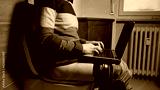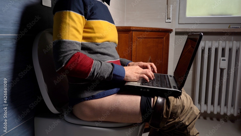 businessman sitting on the toilet wc in apartment works on lap top computer during Covid-19 Coronavirus lockdown quarantine home - smart working concept