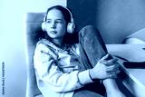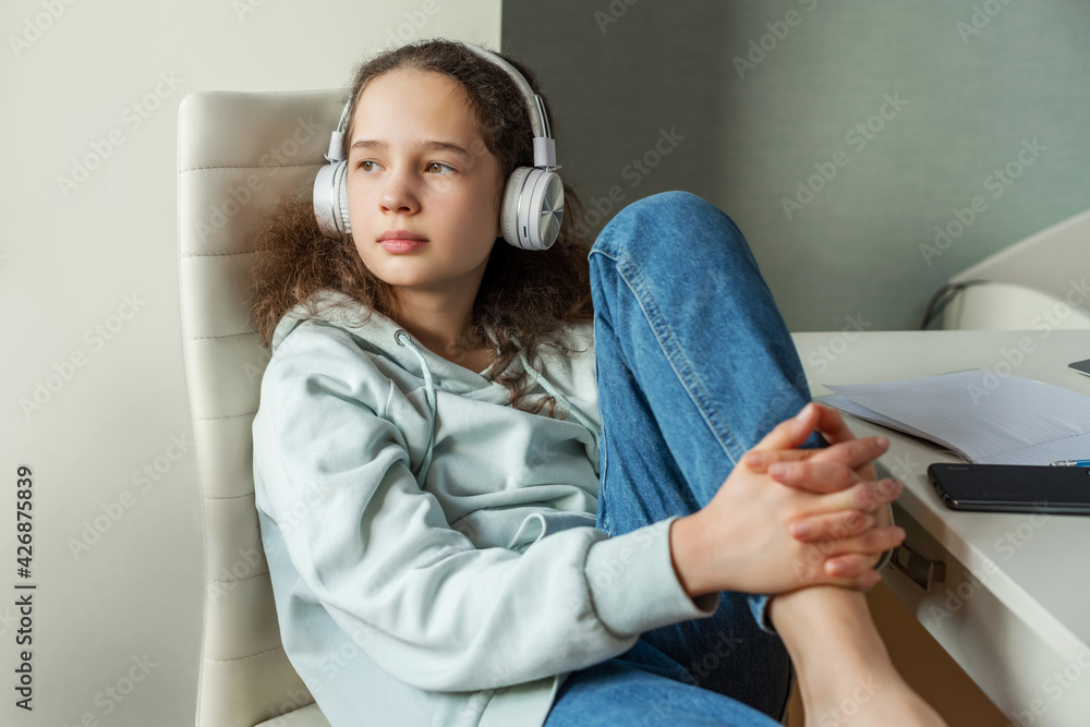 Teen girl wearing headphones is listening calm music or modern audio book at home