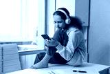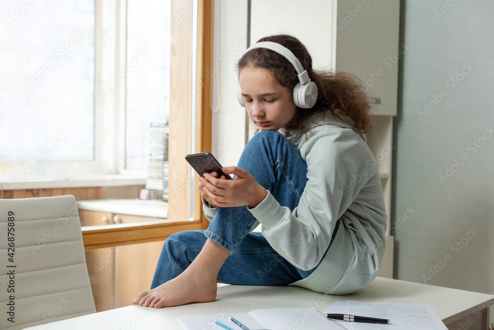 Teen girl in wireless headphones is relaxing listening calm music or modern audio book at home