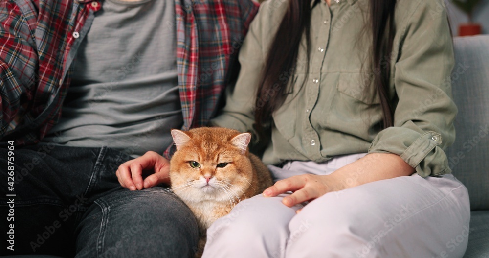 Portrait of Asian cheerful married young couple resting on sofa with cute home pet cat in cozy apartment looking at camera and smiling. Positive emotions, family time together. Love feelings concept