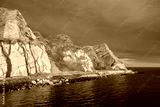 Northern Ireland, UK. Atlantic coast. Cliffs and Antrim Coast Road, a.k.a. Causeway Coastal Route. One of the most scenic coastal roads in Europe. Aerial view near Garron Point in sunrise light