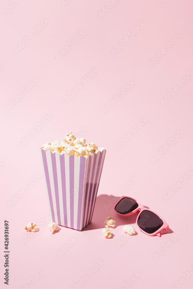 Pop corn striped box and glases for a movie night. Retro scene in pastel colors.