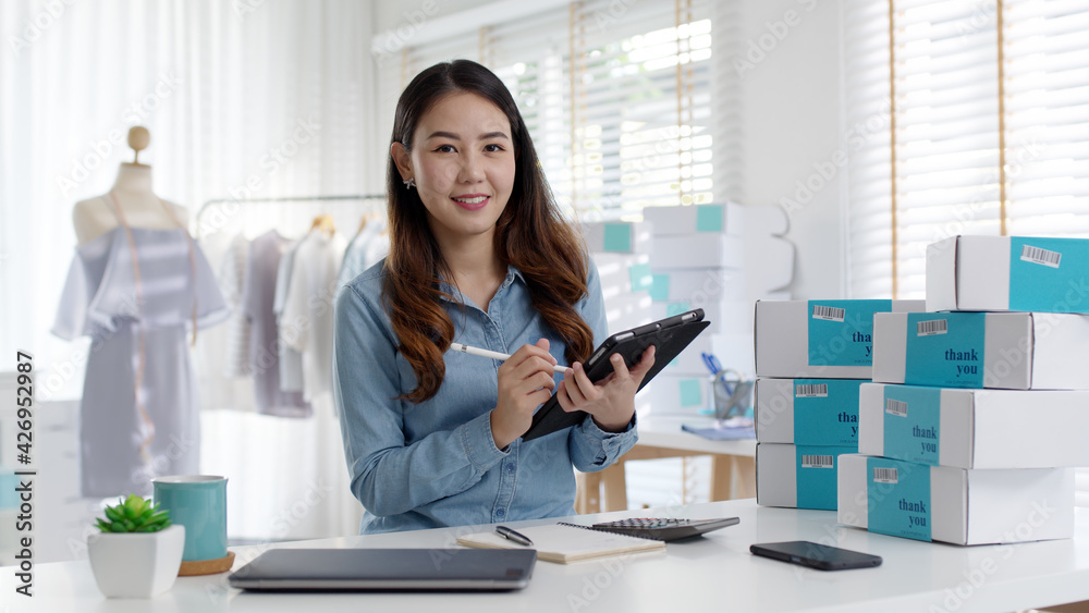 Portrait young attractive asia female owner startup business look at camera work happy with box at home prepare parcel delivery in sme supply chain, procurement, omnichannel commerce online concept.