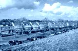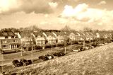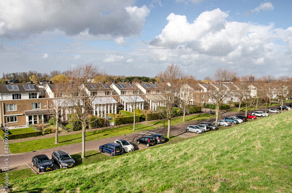 Rotterdam, The Netherlands, March 27, 2021: suburban row houses with solar panels and parked cars at the foot of a sound barrier in Nieuw Terbregge neighbourhood