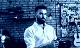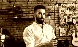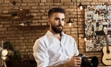 Portrait of young photographer holding camera sitting in front of brick wall in at trendy industrial loft photo studio.