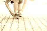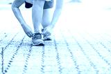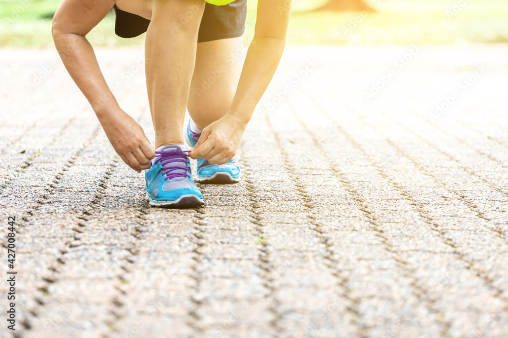 Runner woman tying laces. Runner trying running shoes getting ready for the run for exercise motivation and health and fitness.
