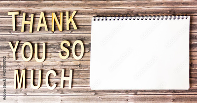 Thank you so much , text made of wooden letters on a wooden table, next to a notepad for writing.