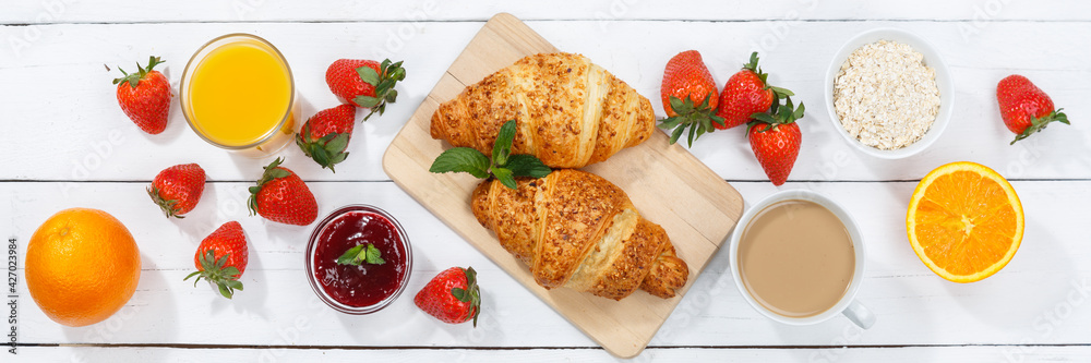 Croissant breakfast croissants orange juice coffee food wooden board from above banner