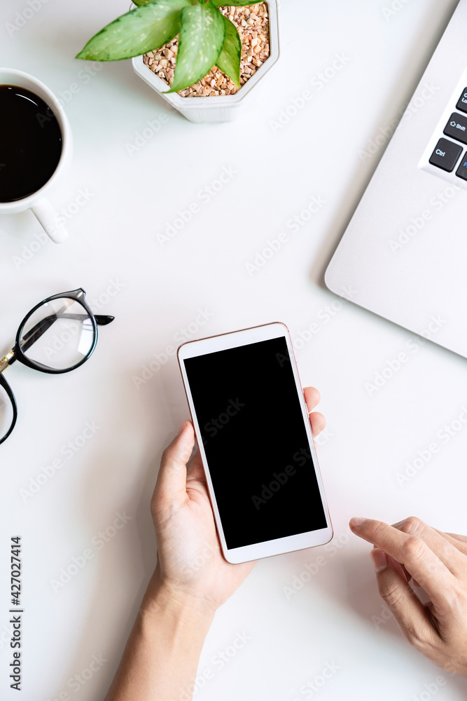Hand holding empty screen Smart phone on business desk office with copy space, Top view