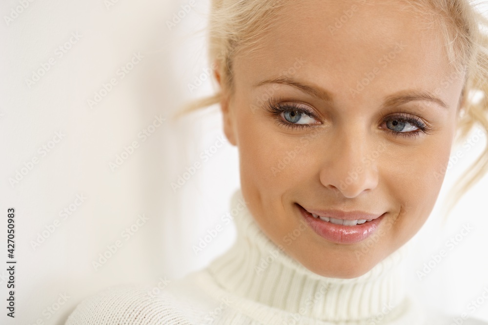 Closeup portrait of happy blonde woman in white pullover.