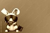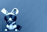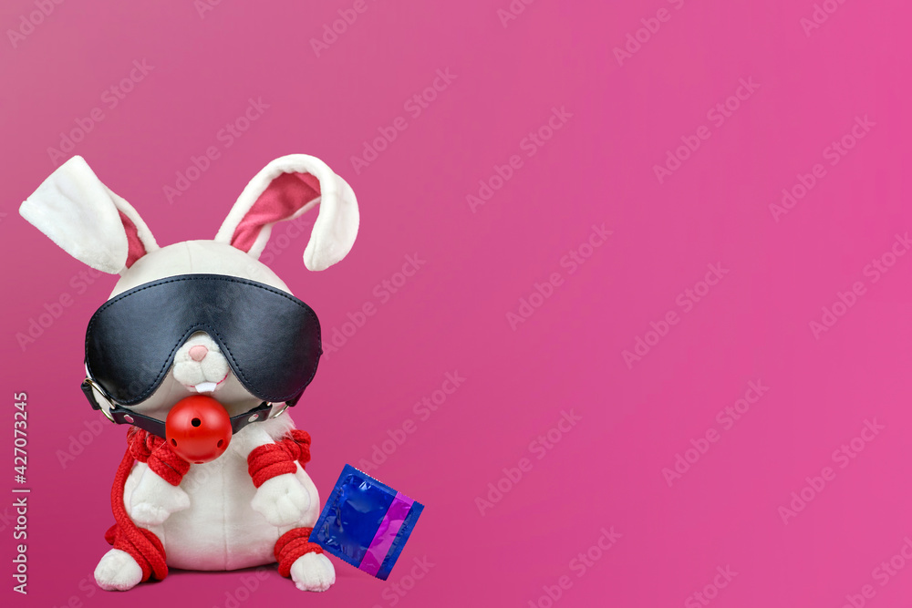 A bound toy rabbit dressed in BDSM accessories. A banner for a sex shop. A toy rabbit with a condom. The concept of protection against sexually transmitted diseases