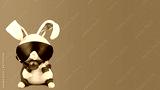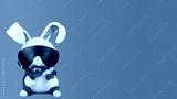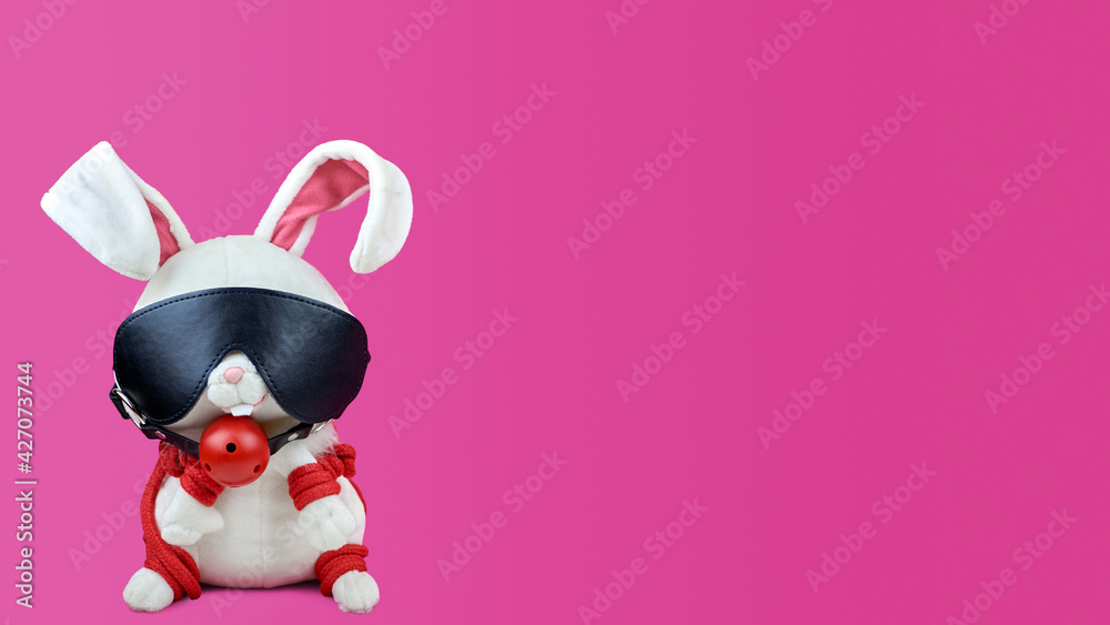 Toy rabbit dressed in BDSM accessories. A banner for a sex shop. Toy rabbit tied with a rope on an isolated pink background.