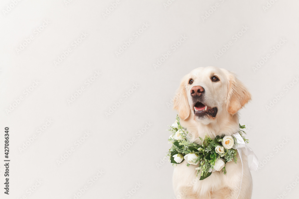 Golden Retriever wearing wreath made of beautiful white flowers on white background looking up close-up