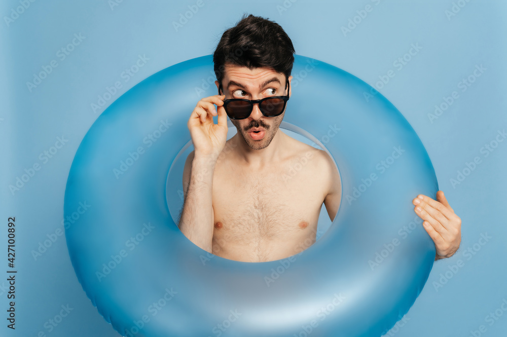 Amazed excited shirtless cheerful caucasian foolish guy in a sunglasses looks surprised through inflatable ring to the side, stands on blue isolated background, beach time, summer concept