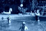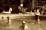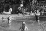 Mother playing ball with daughters children in swimming pool on home backyard. Mom and sisters siblings having fun in swimming pool together. Summer outdoor water activity for family and kids.