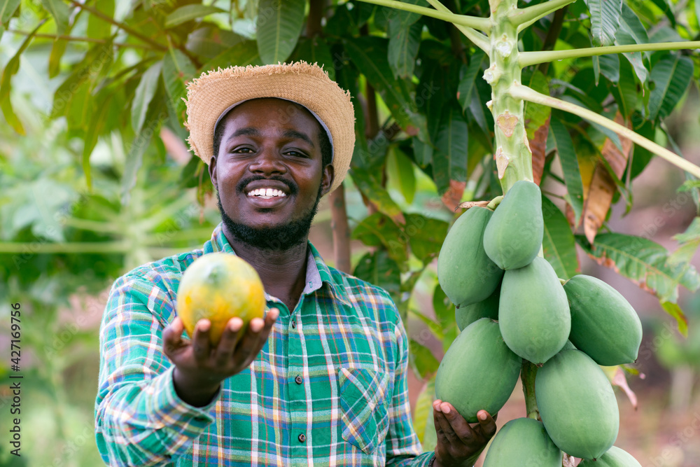 African farmer holding papaya at organic farm with smile and happy.Agriculture or cultivation concept