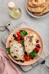 Dinner with cod fish steaks baked with tomatoes and black olives. Bread, olive oil. Healthy food. Grey background, top view, vertical image.