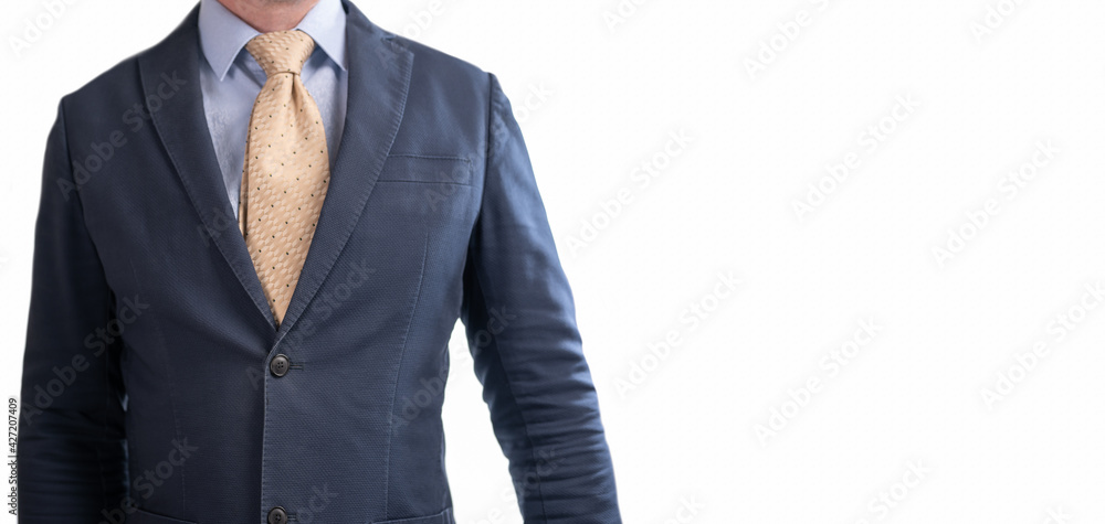 Close-up of torso man in suit and tie. torso of a Businessman in a suit. isolated on white. Cropped portrait of a successful businessman dressed in an elegant formal suit. banner