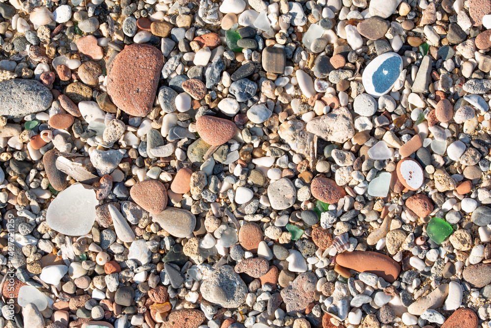 Background and texture of many round stones, cut by the sea and lying on top of each other, with cut shards in between