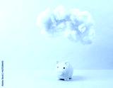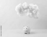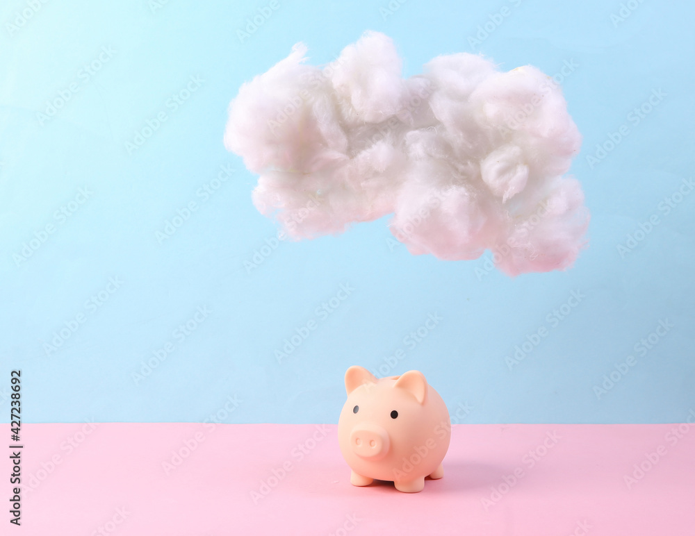 Piggy bank with cloud on pastel pink blue background. Invest or credit. Creative idea. Minimal concept. Pastel color trend