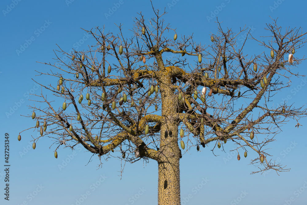 Close-up of the crown of a bare silk silk tree (Ceiba speciosa), with spines and elongated fruits, against a blue sky, in Sicily
