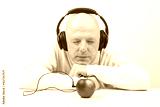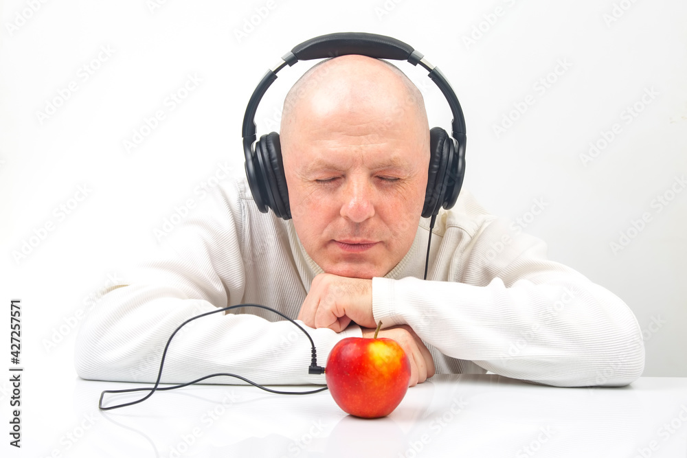 happy man in light clothes wearing portable full-size headphones listens to music using an apple player.