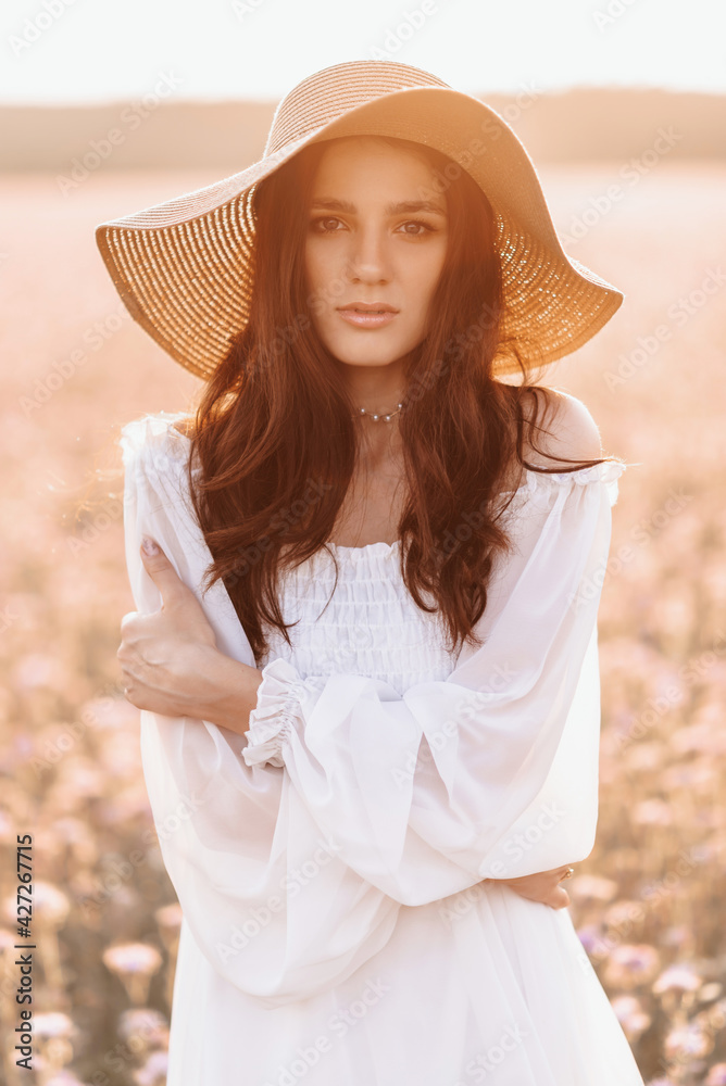 Beautiful brunette in a lavender field at sunset Amazing Portrait