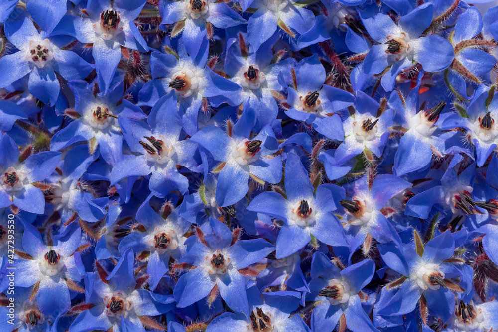 Background from many blue flowers of boretsch or cucumber herb or kukumerkraut (Borago officinalis), which are on top of and next to each other