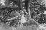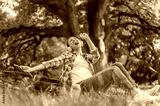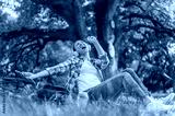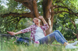 Woman with headphones sitting on a grass in a public park listening music over smartphone singing loud. Positive emotions