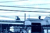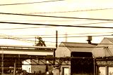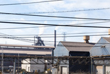 Criss cross of power lines before a working steel mill, blast furnaces and large warehouse buildings, horizontal aspect