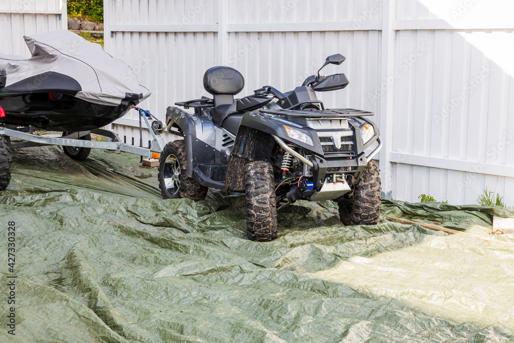Close up view of off-road vehicle with water scooter with a scooter on trailer on white fence background. Sweden.