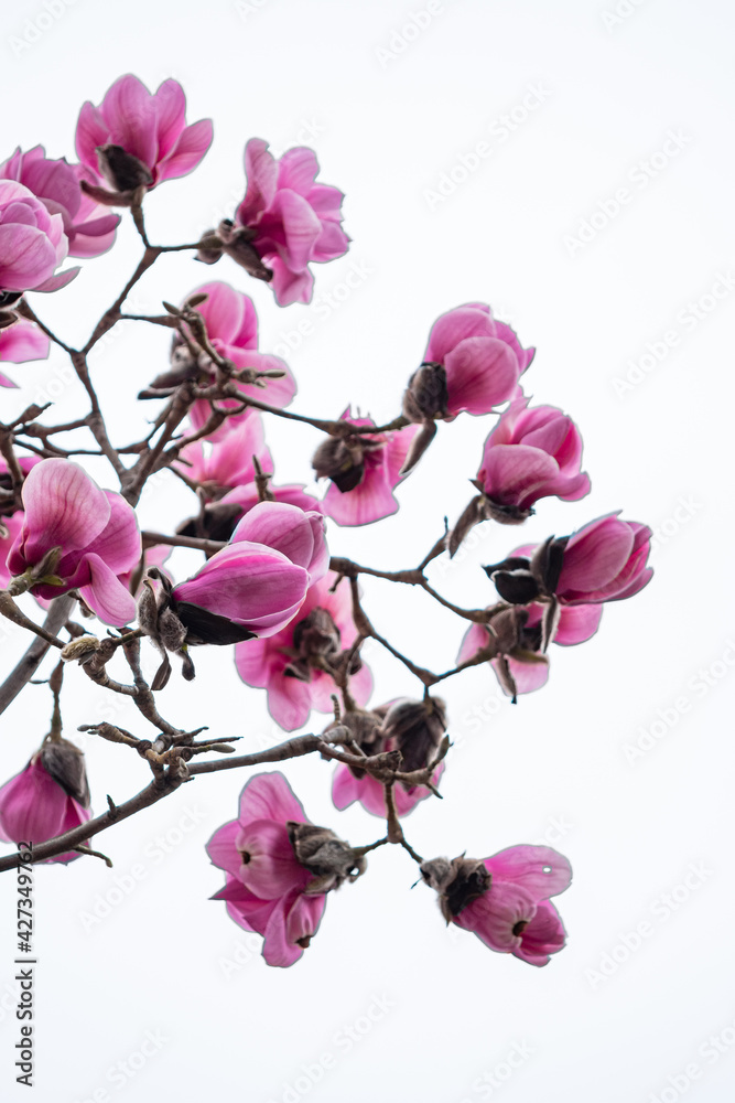 beautiful pink magnolia flowers blooming on the branches in front of white background