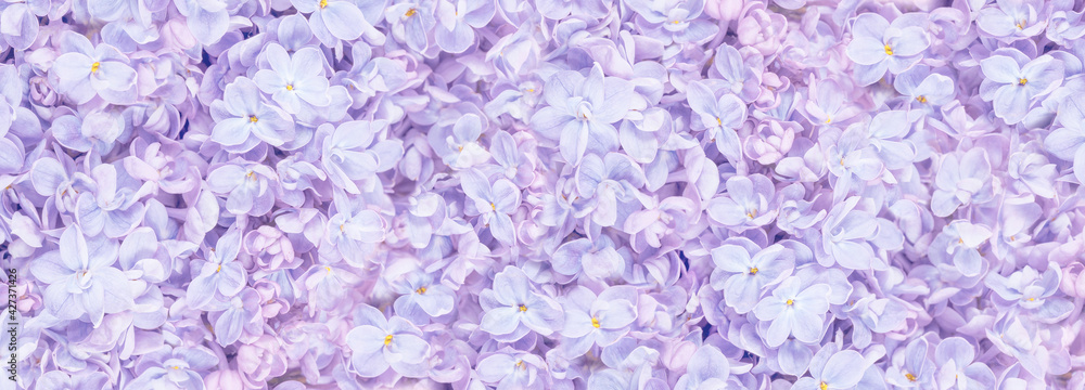Full frame Lilac flowers closeup on tender violet background. Full frame. Spring flowers for birthday Mothers or Womens Day greeting card. Copy space. Wedding border banner