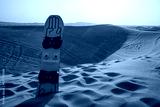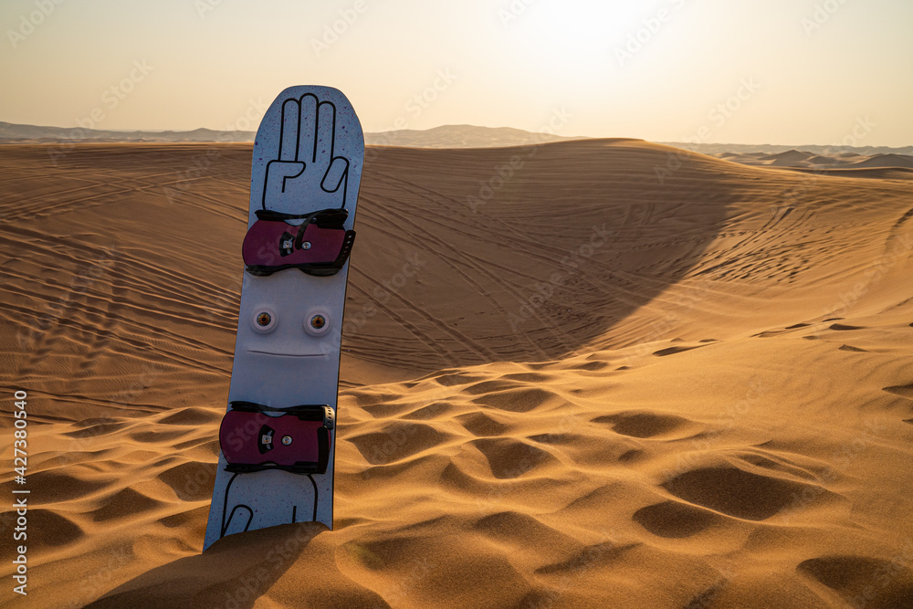 Desert safari tour in UAE. Snowboard used for sand boarding standing inserted in sand dune