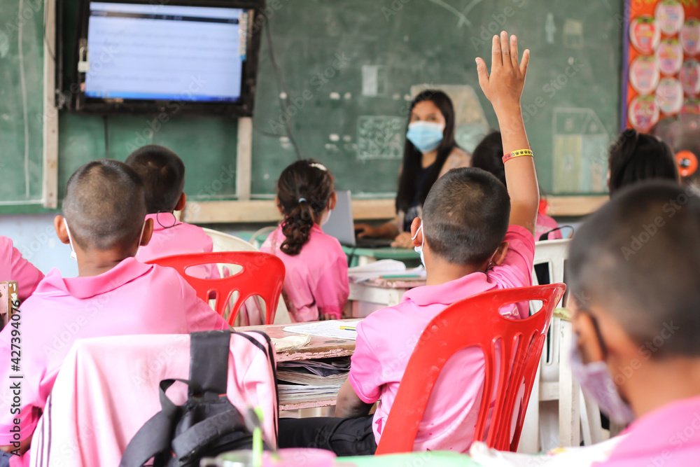 The boy raised his hand to ask the teacher in the classroom