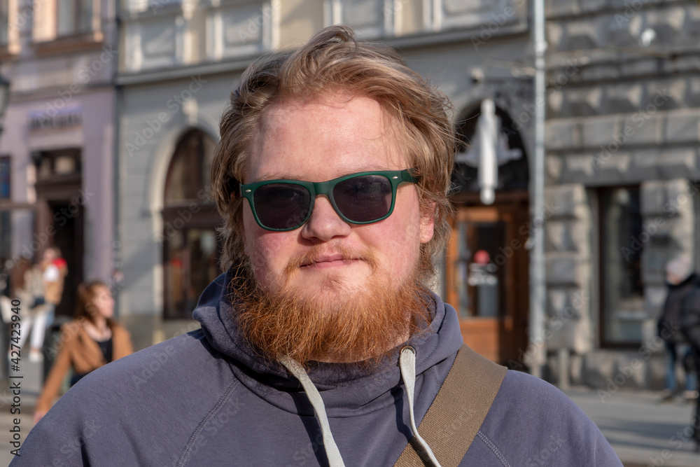 Street portrait of a smiling blonde 25-30 years old in sunglasses and with a beard on the background of the city. Perhaps he is a student or an IT specialist, a successful businessman or a salesperson