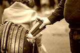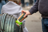 A man's hand throws a paper coffee cup into a street trash can, close-up, selective focus. Concept: eco-friendly packaging and packaging, overflowing trash.