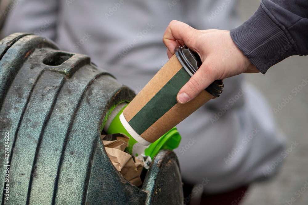 A man's hand throws a paper coffee cup into a street trash can, close-up, selective focus. Concept: eco-friendly packaging and packaging, overflowing trash.