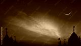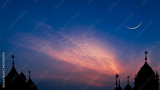 Mosques Dome on dark blue twilight sky and Crescent Moon on background, symbol islamic religion Ramadan and free space for text arabic, Eid al-Adha, Eid al-fitr