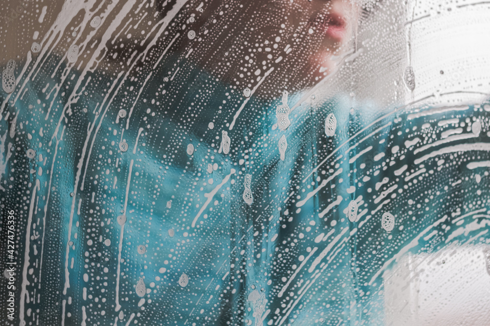 A woman in blue clothes through a soapy glass. The concept of cleanliness in the house