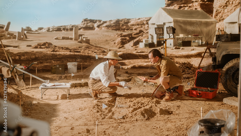 Archeological Digging Site: Two Great Archeologists Work on Excavation Site, Carefully Cleaning with Brushes and Tools Newly Discovered Ancient Civilization Cultural Artifacts, Fossil Remains
